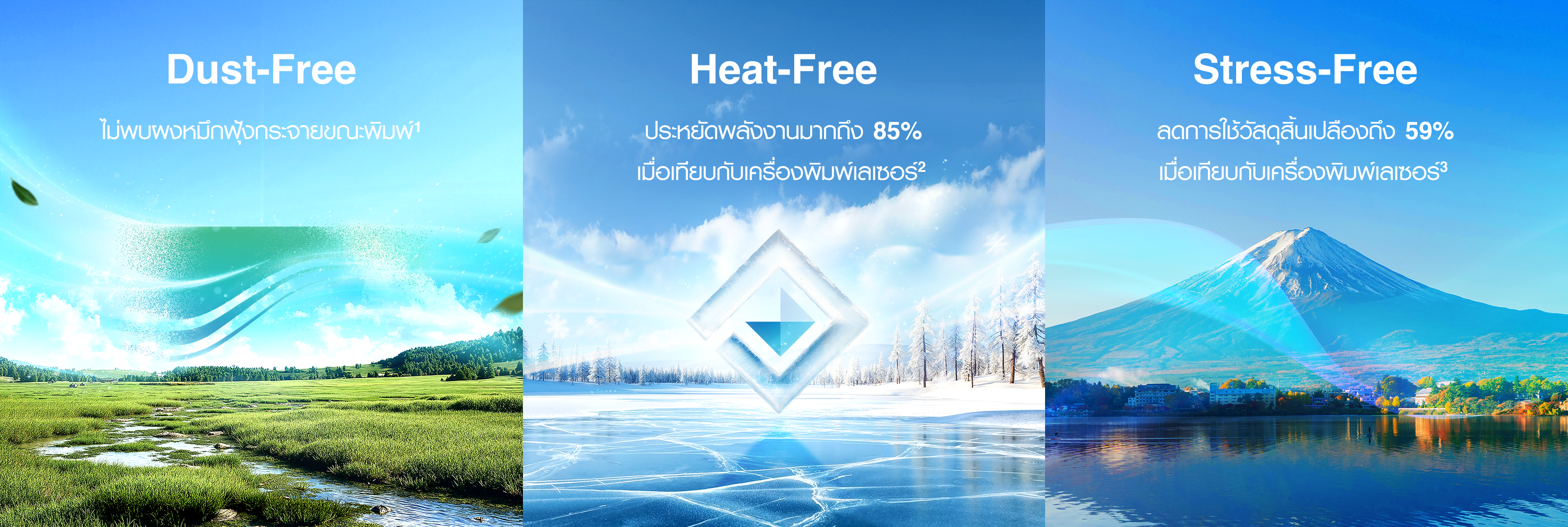 เทคโนโลยีอิงค์เจ็ทได้พลิกโฉมประสบการณ์การพิมพ์สำหรับสถานที่ทำงานยุคใหม่ ด้วยนวัตกรรมสำคัญ Dust-Free1, Heat-Free2, และ Stress-Free3 ส่งมอบโซลูชันการพิมพ์ที่ออกแบบมาเพื่อลดการใช้พลังงาน พร้อมประสบการณ์การพิมพ์ที่ไว้ใจได้และรับผิดชอบต่อสิ่งแวดล้อม เพื่อเสริมประสิทธิภาพการทำงานในหลากหลายอุตสาหกรรม
