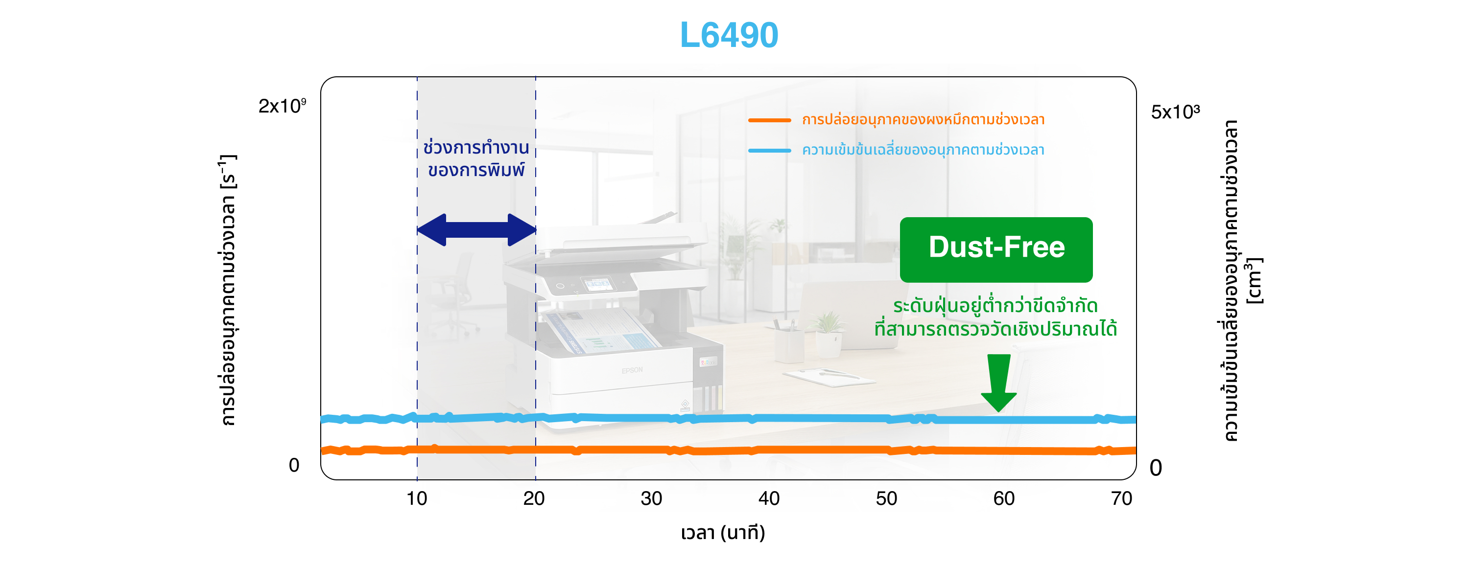 *ภายใต้เงื่อนไขการทดสอบเฉพาะทาง ภายในห้องทดสอบ (chamber test conditions) ที่ดำเนินการโดยสถาบันเทคโนโลยีและการทดสอบอุตสาหกรรม ประเทศเกาหลี โดยทดสอบกับเครื่องพิมพ์อิงค์เจ็ทของเอปสัน รุ่น AM‑C4000, AM‑C400 และ L6490 ผลการทดสอบแสดงว่าระดับฝุ่นอยู่ต่ำกว่าขีดจำกัดที่สามารถตรวจวัดเชิงปริมาณได้ ซึ่งบ่งชี้ว่าไม่มีการตรวจพบอนุภาคฝุ่นที่เกิดจากเครื่องพิมพ์ในระหว่างการทำงาน